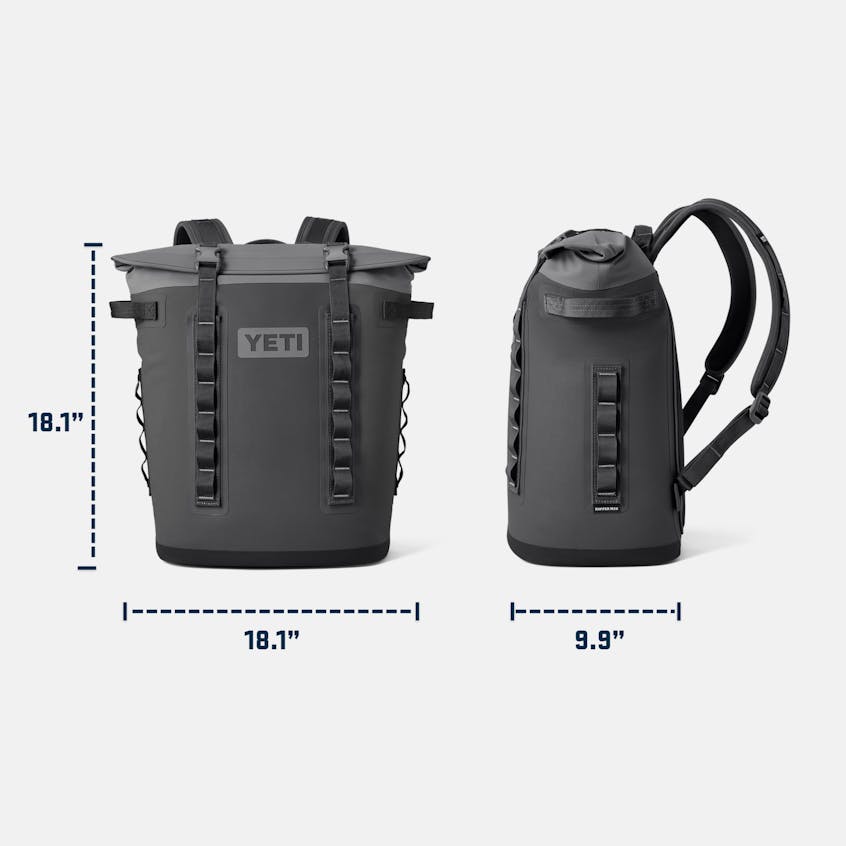 The YETI Hopper® M20 is a 26 lb-capacity, hands-free soft backpack cooler featuring a secure magnetic MagShield Access, durable DryHide Shell, and HitchPoint™ Grid for accessories. It comfortably carries up to 36 cans (or 22 lbs of ice) for full-day excursions.
